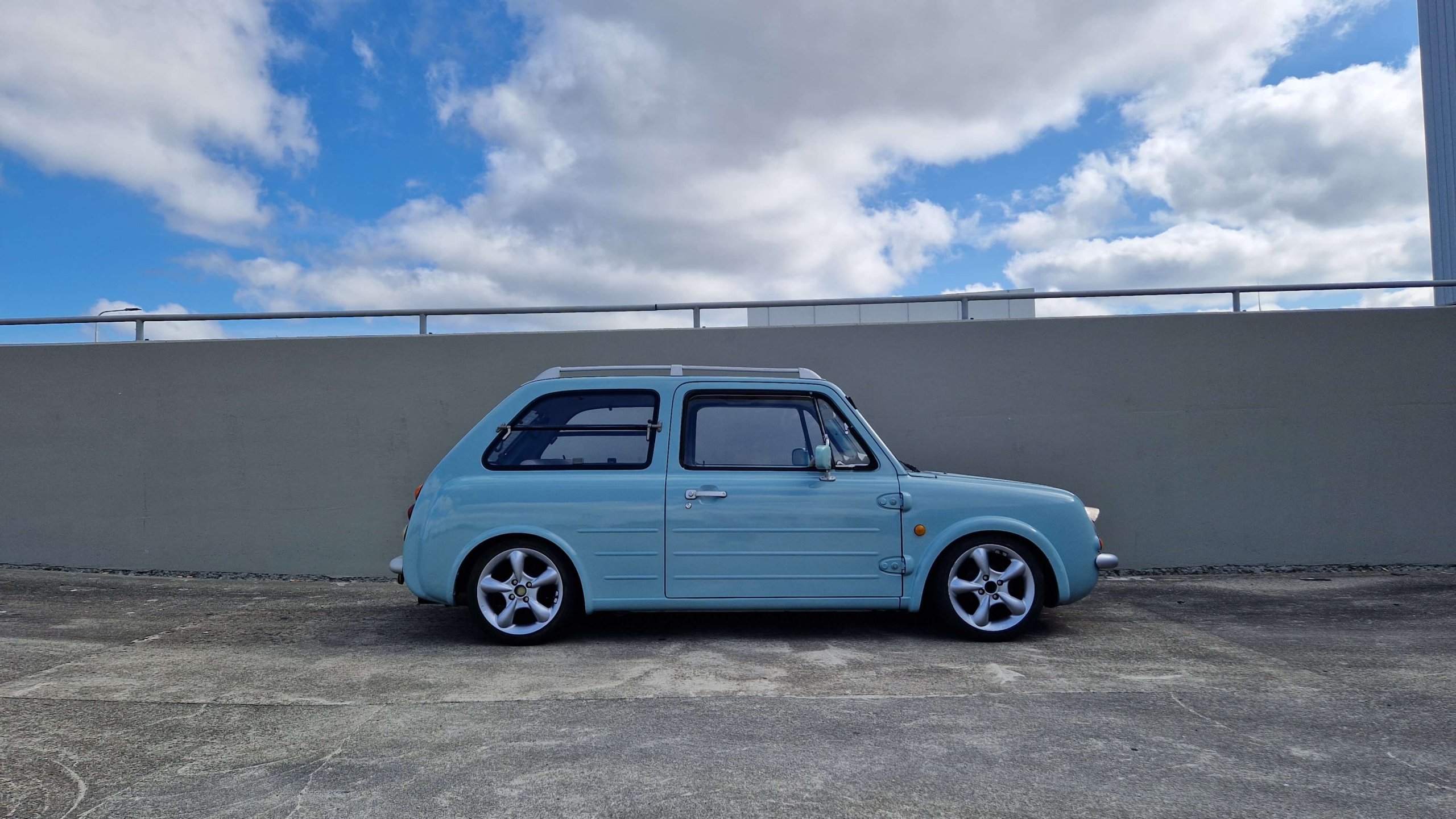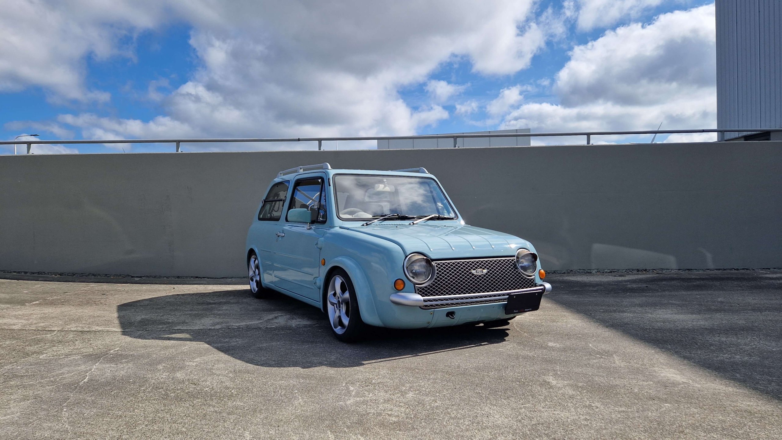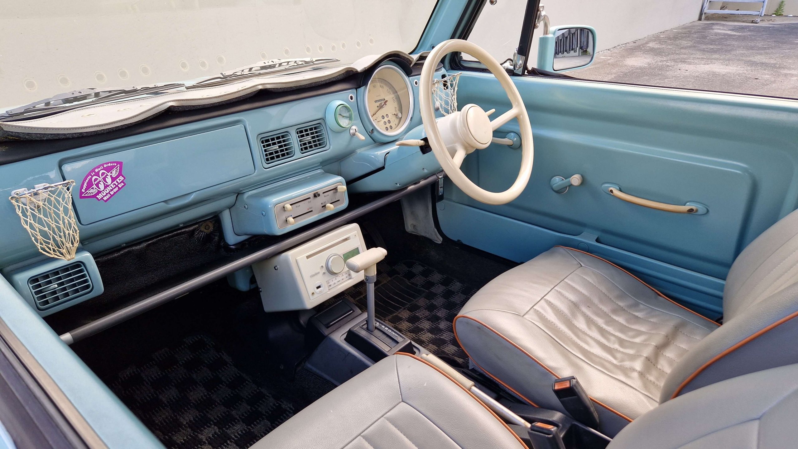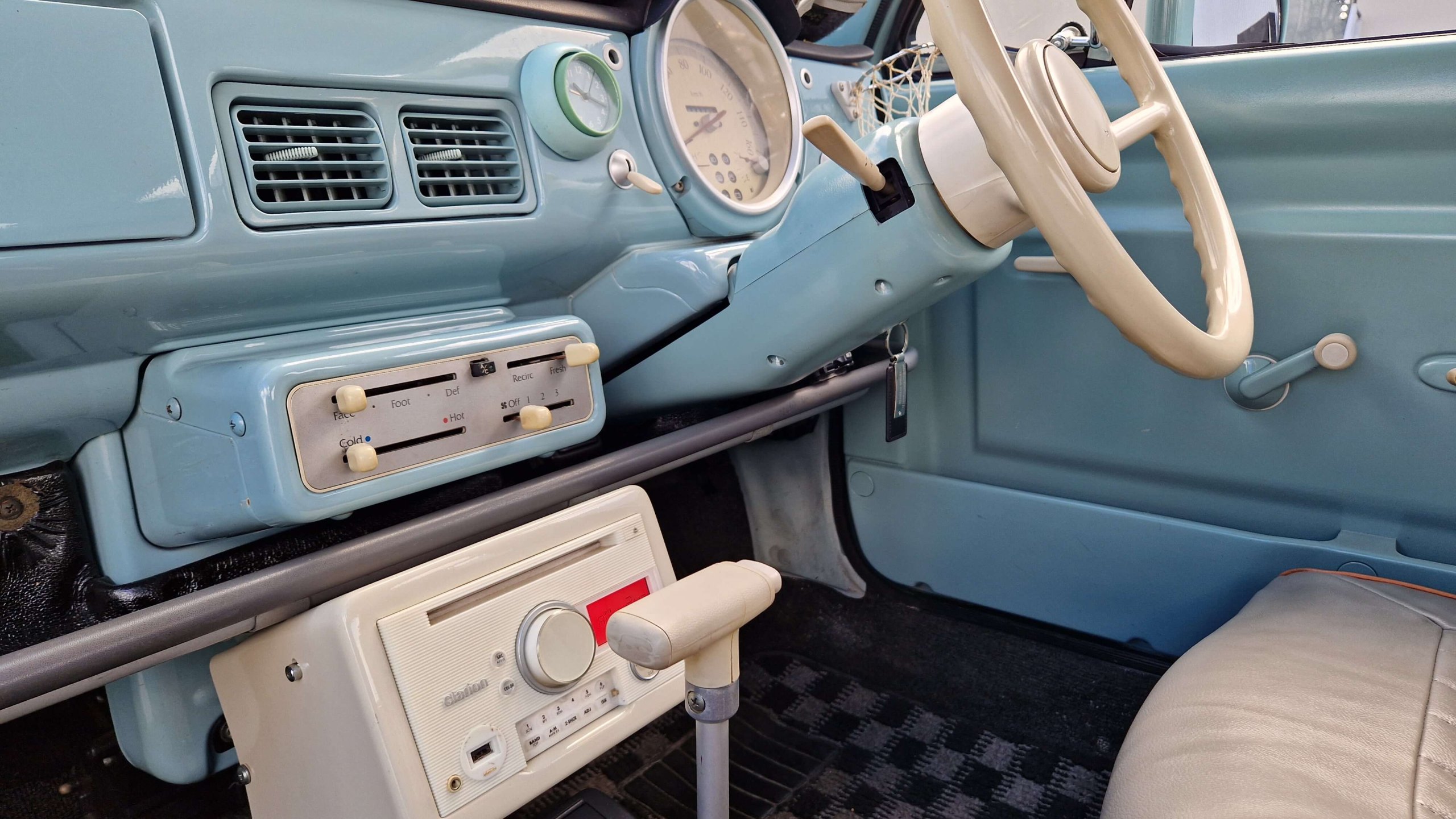 Retro-chic design is incorporated in every detail, and the interior is unique with triangular windows, outward-facing door hinges, three round tail lenses lined up, an ivory-inspired steering wheel and round meters.